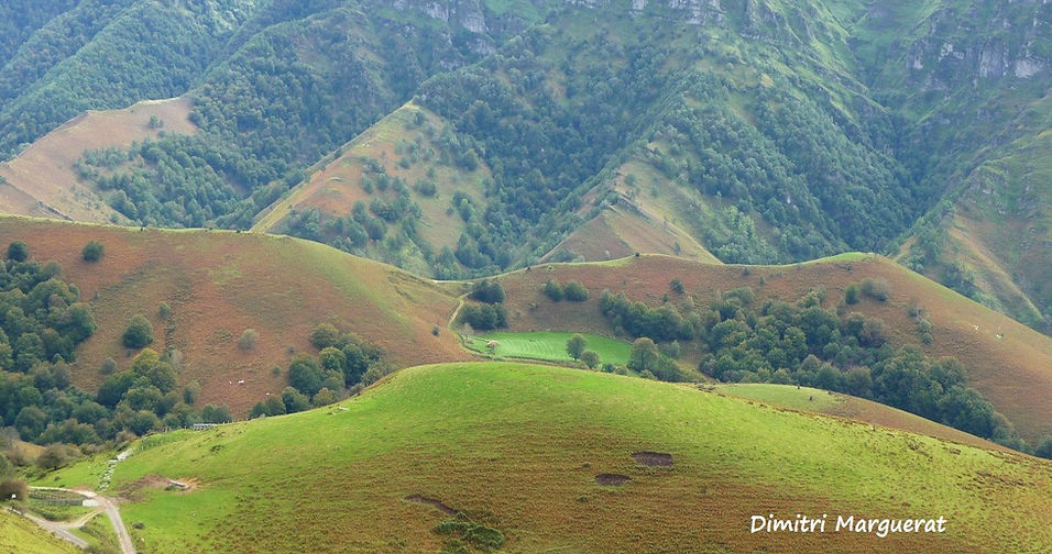 Le massif du Larla culmine à seulement 700 m mais il présente en son sommet un panorama privilégié sur les belles crêtes d’Iparla. Cette première excursion permet de nous mettre en jambes et de découvrir facilement diverses facettes du Pays Basque. Que nous restions sur ses pentes ou bien que nous arrivions au sommet, qui n’est pas difficile à atteindre, cette petite montagne nous réserve de belles surprises. De nombreux Milans royaux, Vautours fauves et Buses variables rodent sur ses pentes. Le Chocard à bec jaune et le Crave à bec rouge évoluent souvent ici, tout comme les passereaux caractéristiques des landes et des pâturages : Tarier pâtre, Accenteur mouchet, Pipit farlouse. A la sortie de vieilles galeries de mines témoignant d’un passé métallurgique, suintent des sources ferrugineuses qui alimentent des tourbières. Les sphaignes (mousses semblables à des éponges) qui tapissent harmonieusement le sol accueillent des plantes insectivores : des droséras. Dans les flaques, on trouve de nombreux têtards d’Alyte accoucheur, un petit crapaud dont le mâle s’occupe des œufs.